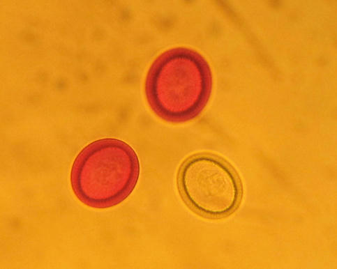 کروی شکل ، دو جداره . دارای خطوط شعاعی در بین دو جداره . ( این تخم شبیه به چرخ درشکه میباشد)